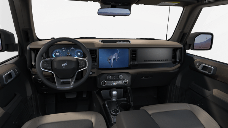 The Bronco's interior is designed for both style and functionality. The washout-capable rubberized flooring with drain plugs makes cleaning a breeze, while the MOLLE strap system on the front seats provides endless customization options. Stay connected with the SYNC 4 infotainment system and enjoy the convenience of features like Dual Smart Charging USB Ports, Connected Navigation, and Ford Co-Pilot360 technology.